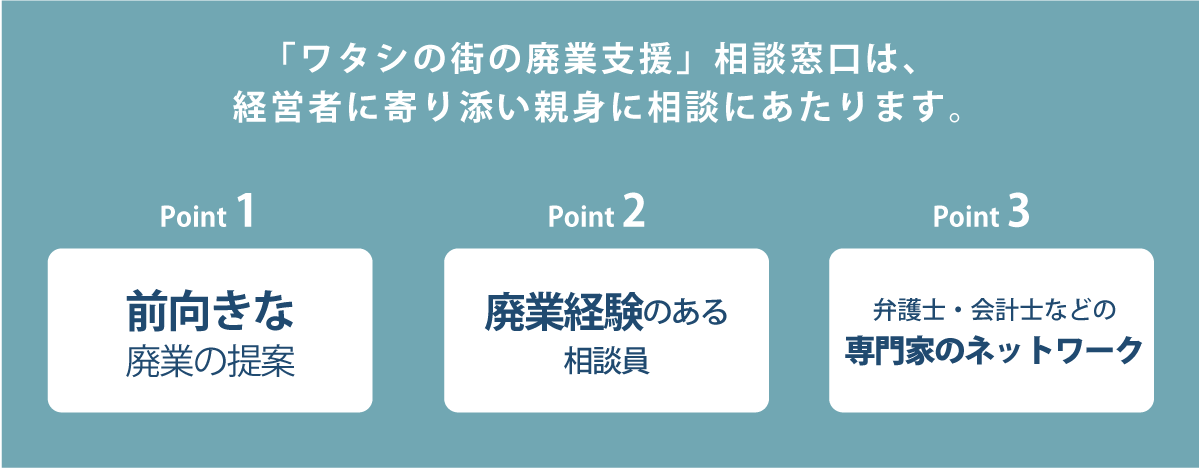 私たちが廃業を考える経営者・事業者の伴走者となり不安や悩みの相談にあたります。