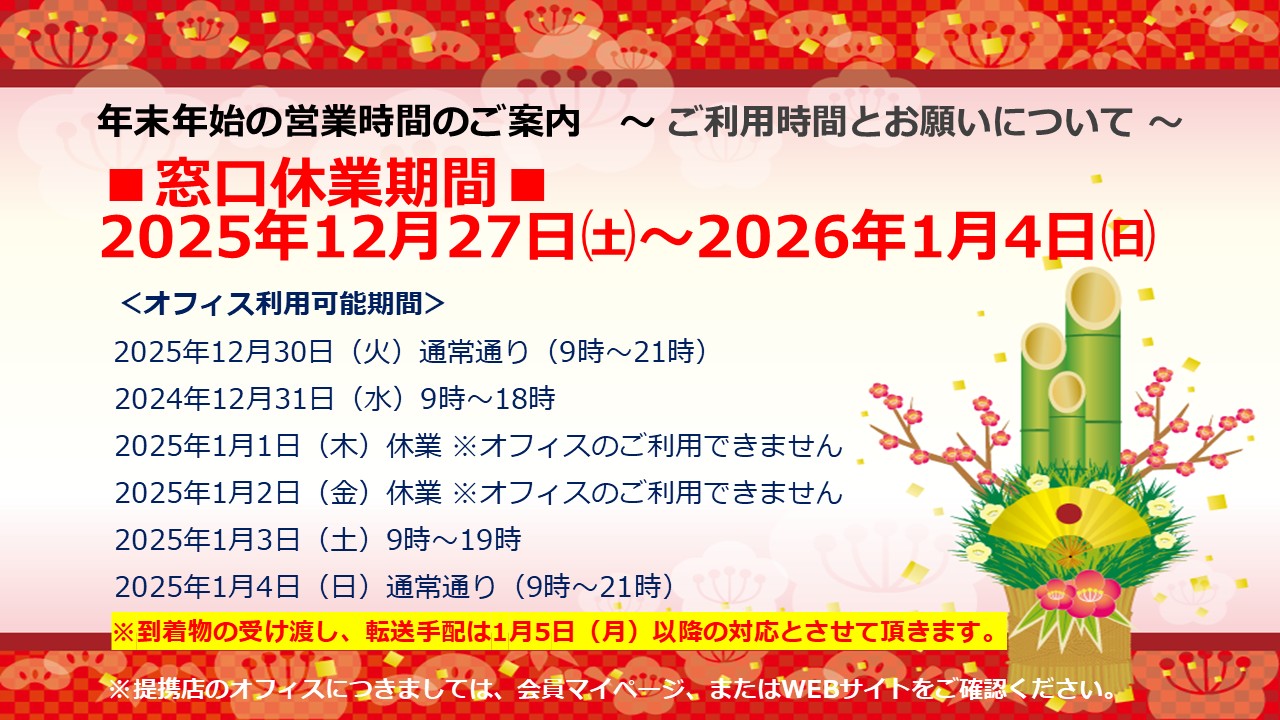 【窓口休業期間】2025年12月27日(土)~2026年1月4日(日)