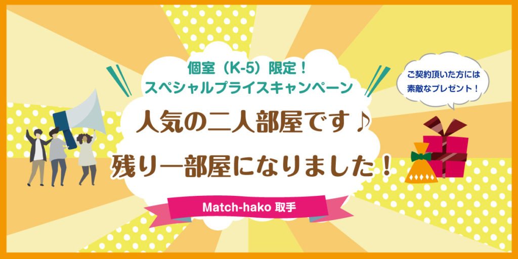 | キャンペーン内容 | Match-hako取手オフィス【個室(K-5)限定】の月額利用料を、スペシャルプライス33,000円(税込)にてご提供致します。 さらにキャンペーン期間中に個室・ブースをご契約して頂いた方には、 「キリンビール一番搾り」350ml 6缶パックをプレゼント。 |