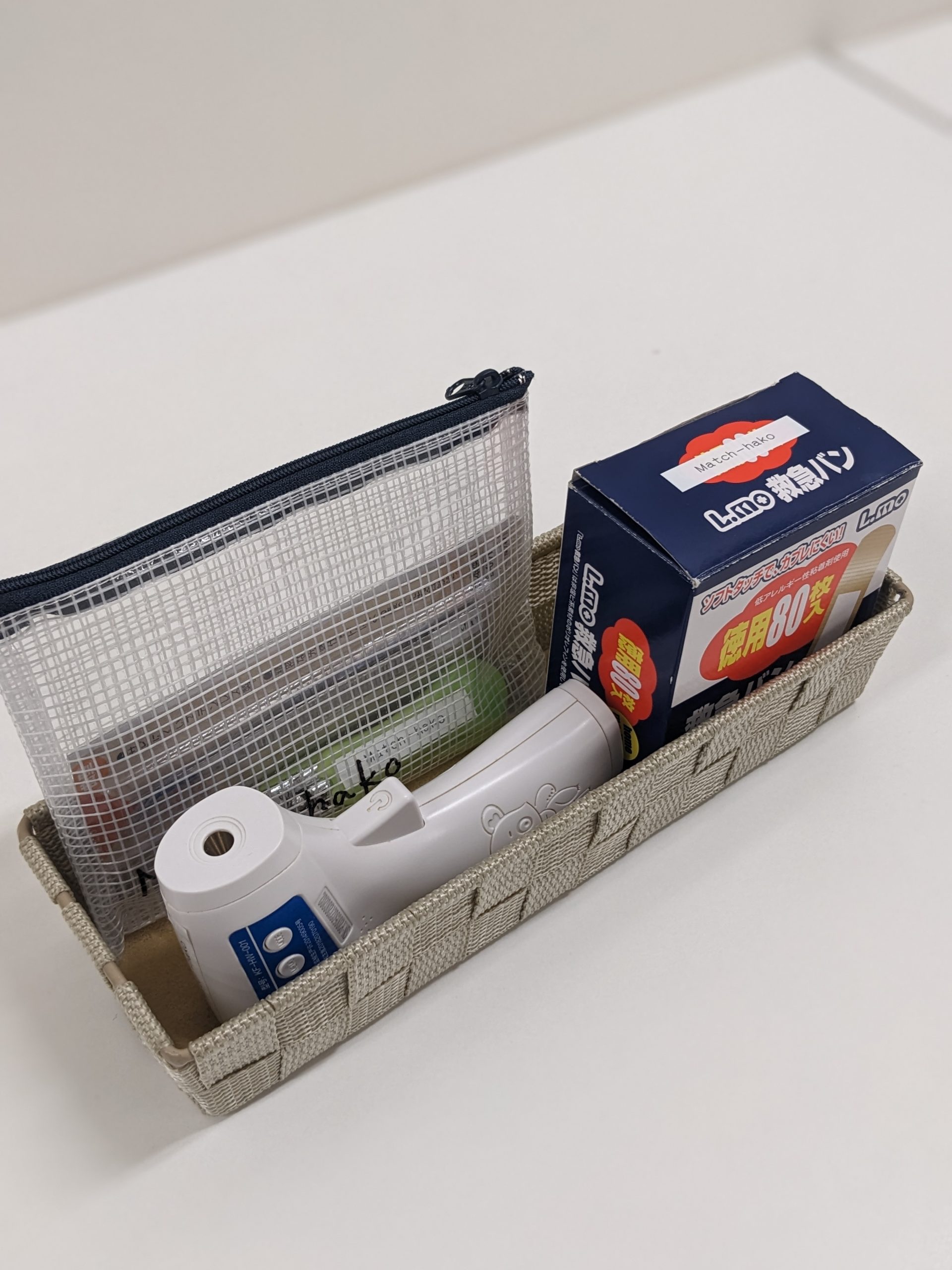入口を正面の本棚に一角に文房具・備品スペースがあります。