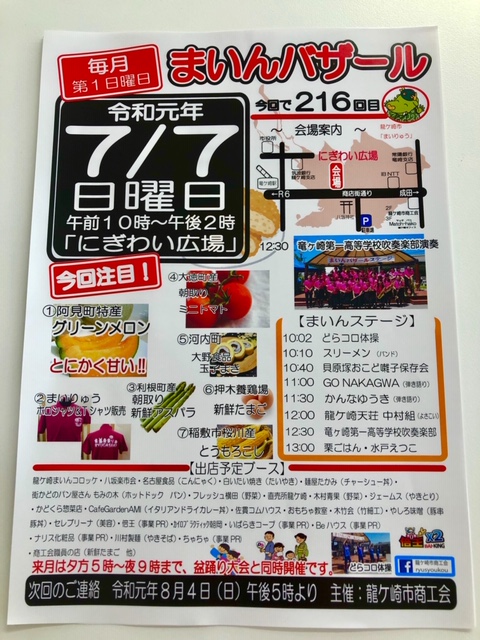 そして、7月7日(日)の七夕に毎月恒例の「まいんバザール」が開催されます。