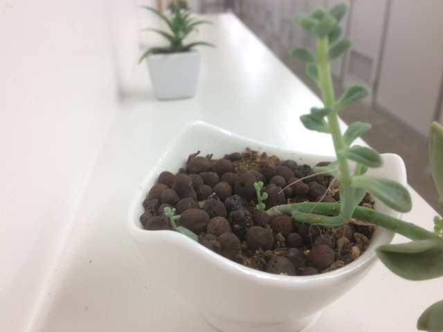 また通路の棚には小さなかわいい多肉植物たちもたくさん飾っています。小さな多肉植物、落葉から小さな小さな赤ちゃん芽がでてきました。多肉植物は挿し葉といって落ちた葉を寝かせておくと勝手に根がでてきて赤ちゃん芽が育つんですよね。ほんとにかわいいです。これらの植物たちに霧吹きでお水をあげるのが毎朝の日課になっています。多肉植物は適度な光と適度なお水で簡単に育てられます✨